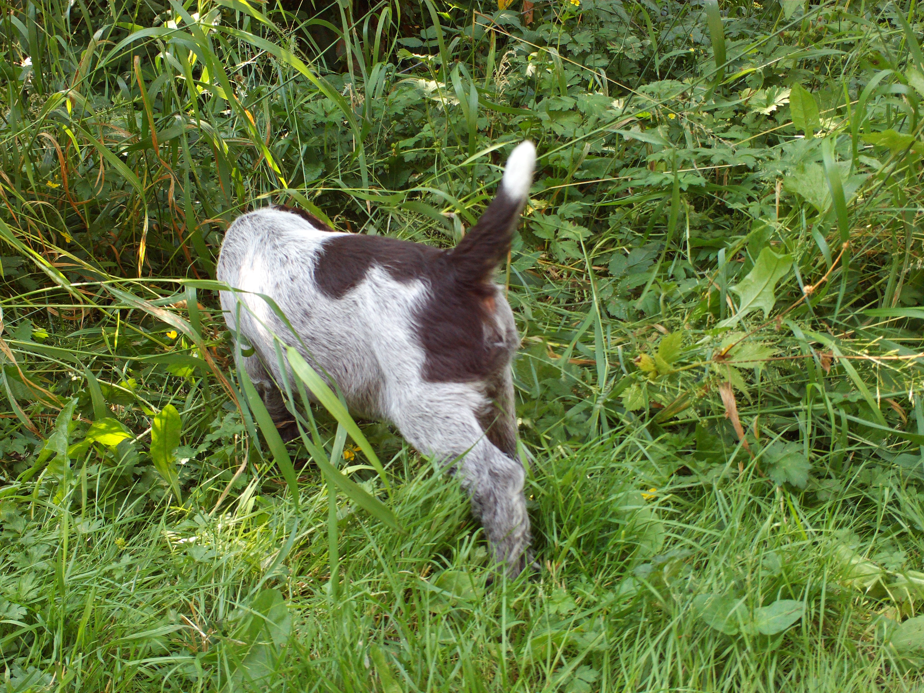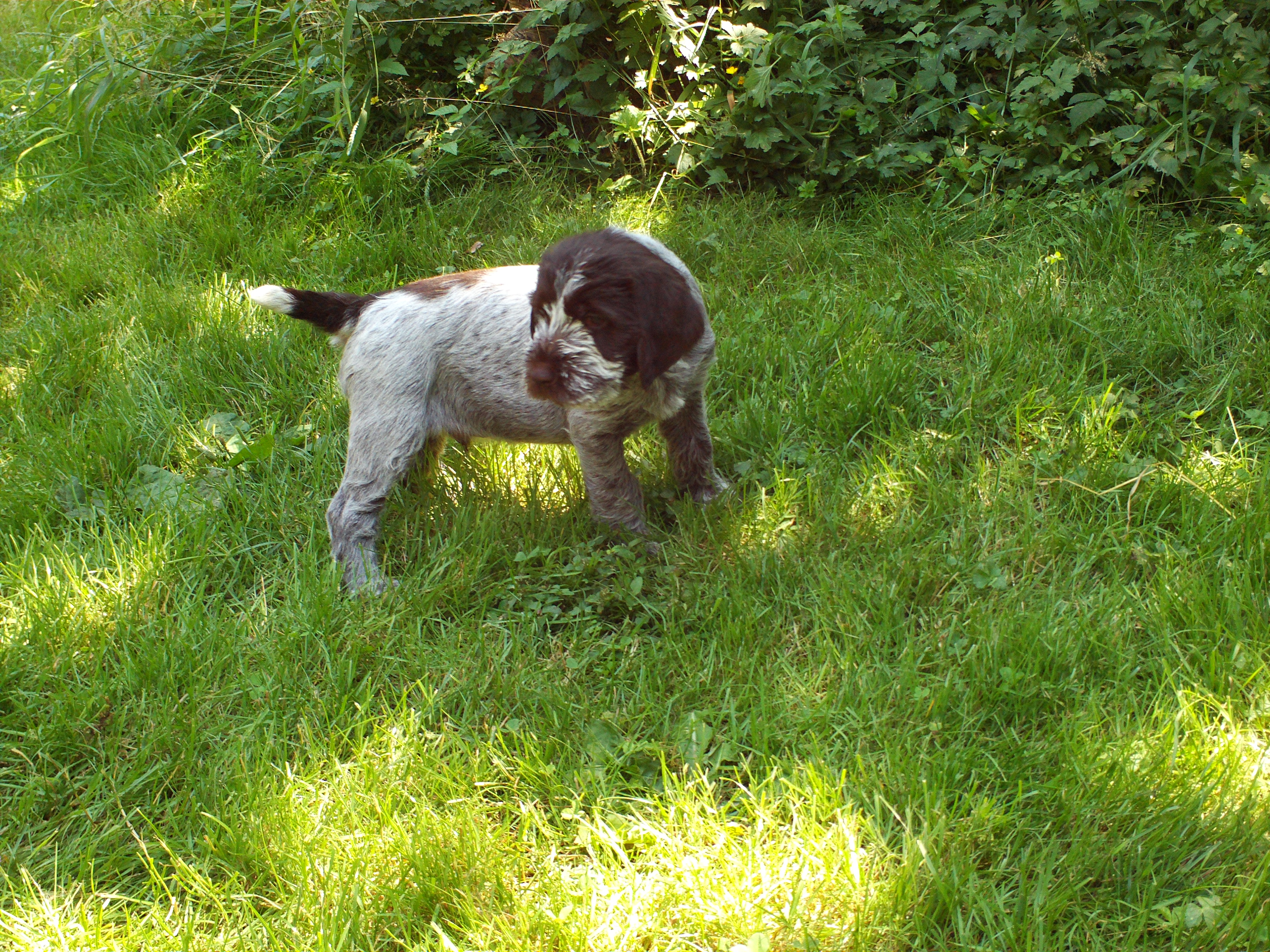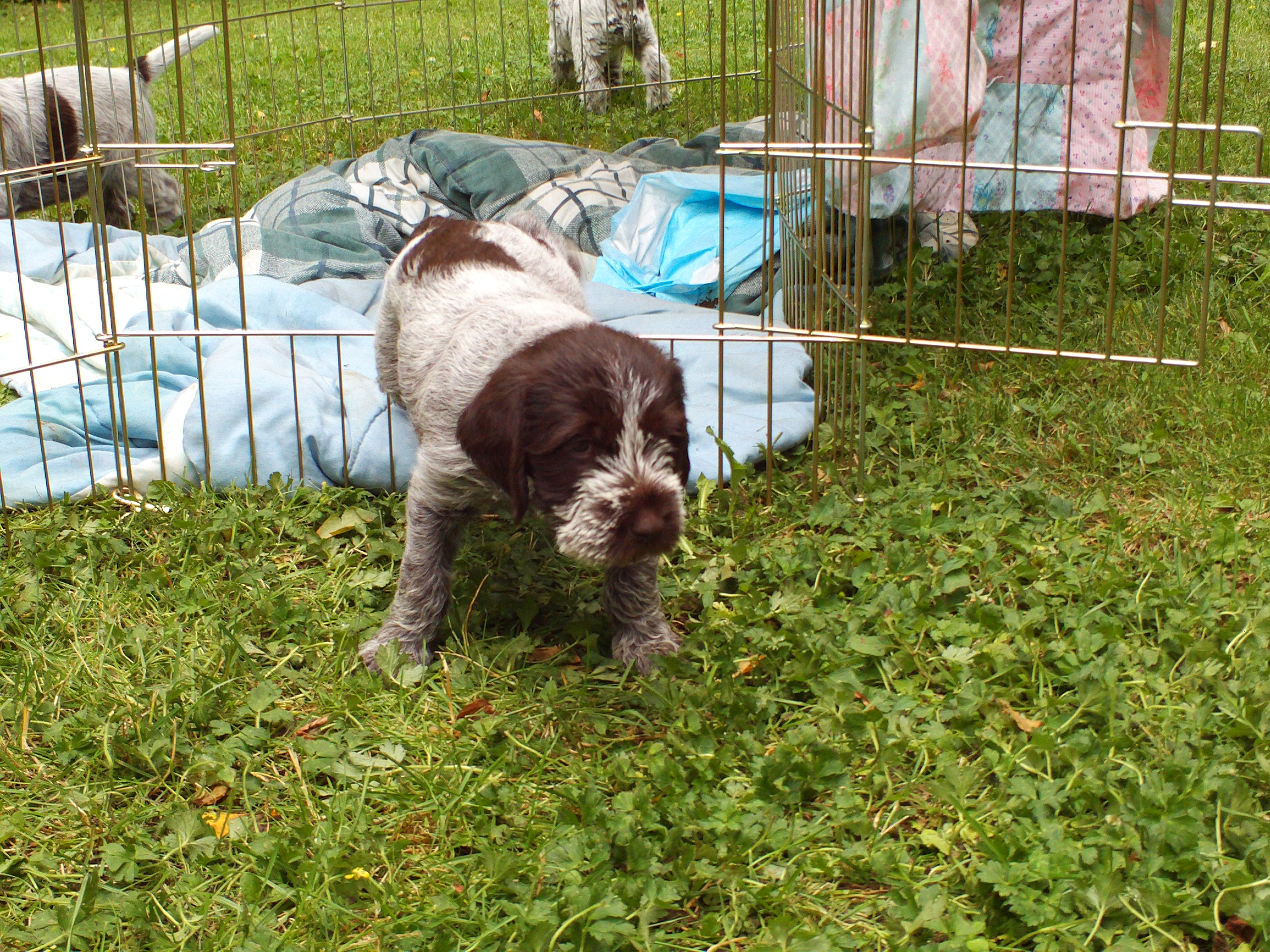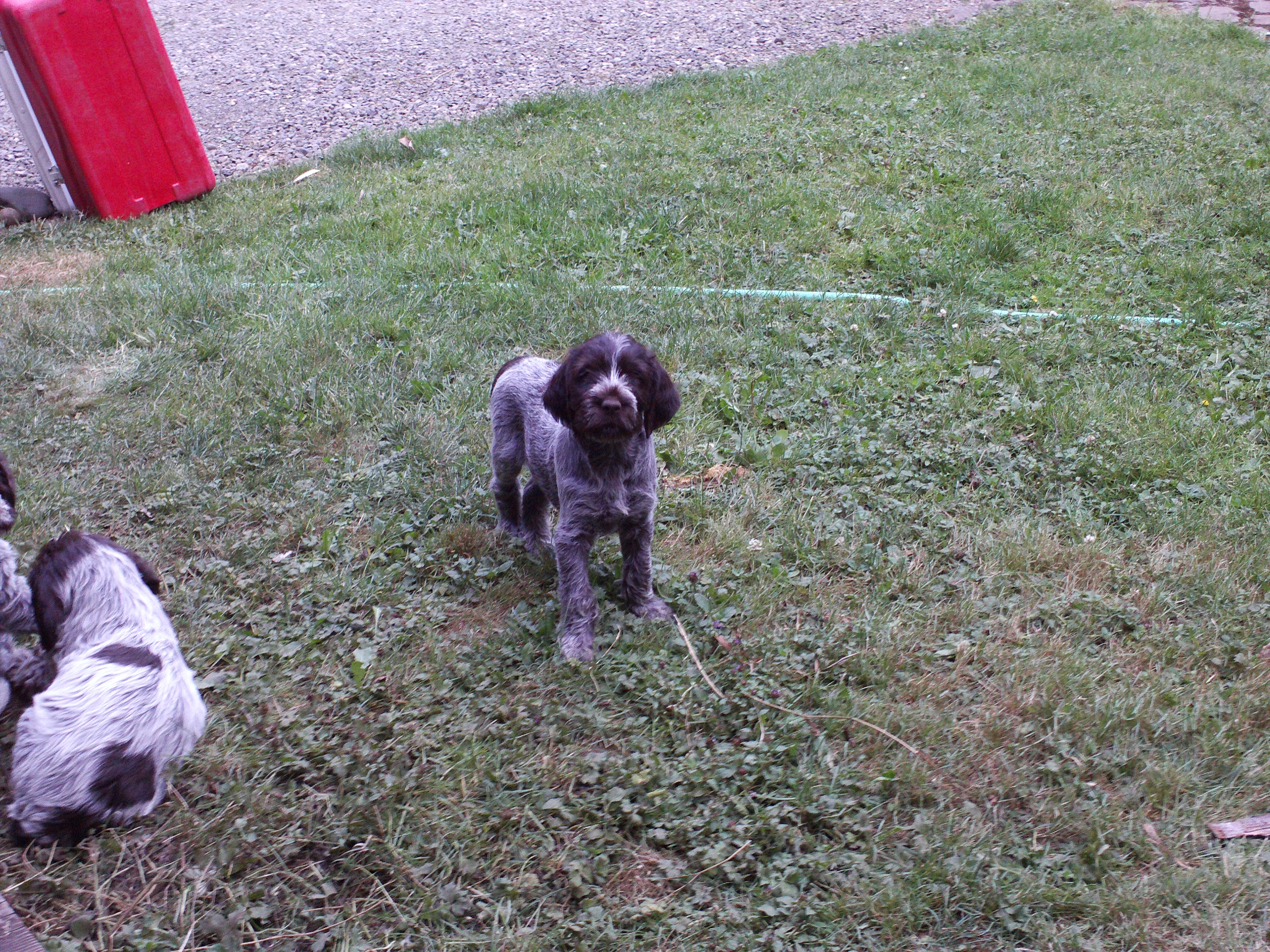 Duchasseur Shiksa is our pure-bred Wire-Haired Pointing Griffon.  Isn't she precious?  She is 4 years old and just had her first and only litter. We bred her with Griffe d'Automne Silver Bullet Four lovely puppies were whelped on June 21st. Three males and one female. See Gordon Creek Gaon's photo links below. After August 19th Gaon will be heading home to his new family in South Dakota! We will miss him! He is gentle when you are, adores being cuddled, and is quite keen on hunting.